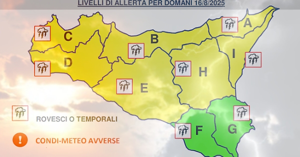 Sulla base dei fenomeni in atto e previsti è stata valutata per la giornata di domani allerta gialla sulla provincia autonoma di Bolzano, sulla Campania e sulla Calabria, su alcuni settori della Basilicata e su gran parte della Sicilia.