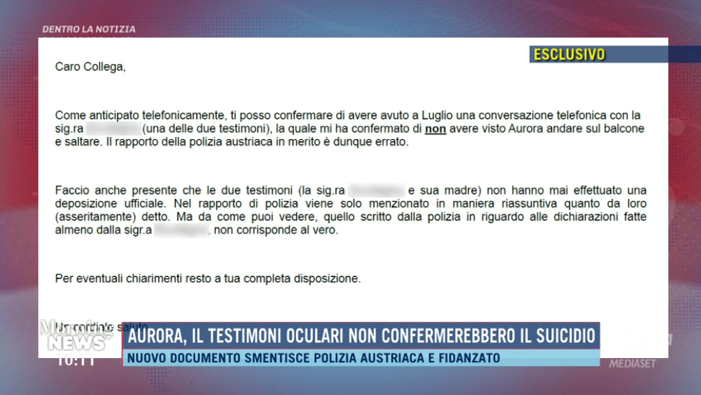 Il documento è stato mostrato durante la puntata di oggi di Morning news, su Canale 5. «Come anticipato telefonicamente - si legge nello scambio di mail - ti posso confermare di avere avuto a luglio una conversazione con la signora (una delle due testimoni), la quale mi ha confermato di non avere visto Aurora andare sul balcone e saltare. Il rapporto della polizia austriaca in merito è dunque errato. Faccio anche presente che le due testimoni (la signora e sua madre) non hanno mai effettuato una deposizione ufficiale. Nel rapporto di polizia viene solo menzionato in maniera riassuntiva quanto da loro (asseritamente) detto. Ma da come puoi vedere, quello scritto dalla polizia in riguardo alle dichiarazioni fatte almeno dalla signora non corrispondono al vero».