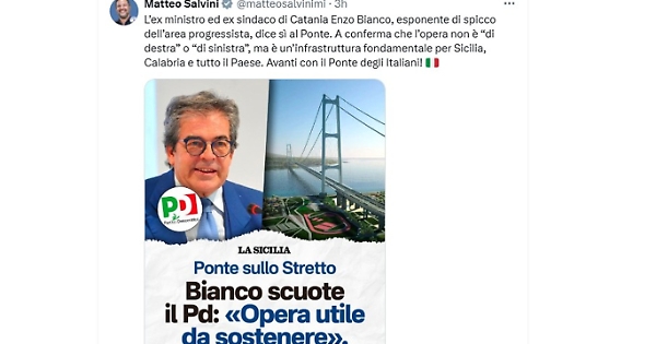L'intervista a La Sicilia di Enzo Bianco e il suo sì al Ponte ha riacceso il dibattito dentro il Pd. Intanto il ministro per le infrastrutture Matteo Salvini, riprendendo l'intervista pubblicato sul nostro quotidiano, ha rilanciato la questione: «L'ex ministro ed ex sindaco di Catania Enzo Bianco, esponente di spicco dell’area progressista, dice sì al Ponte. A conferma che l’opera non è di destra o di sinistra, ma è un’infrastruttura fondamentale per Sicilia, Calabria e tutto il Paese. Avanti con il Ponte degli Italiani!» ha scritto sui suoi social.