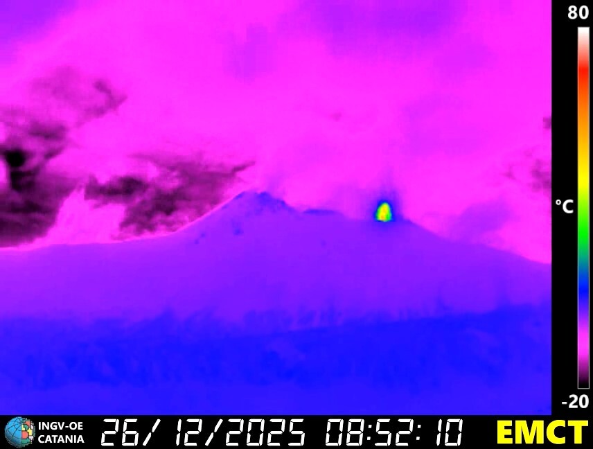 Nel corso della notte si sono verificate esplosioni stromboliane sporadiche anche alla Bocca Nuova, in particolare dalla BN-2, con proiezioni incandescenti spinte fino a diverse decine di metri oltre l’orlo craterico.