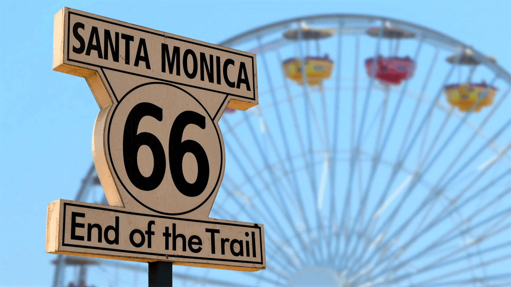 Infine la California. Prima il deserto del Mojave, con i suoi alberi di bottiglie e le tracce del primo McDonald’s, poi l’oceano. La Route 66 si conclude sul Santa Monica Pier, davanti all’insegna “End of the Trail”, dove il Pacifico sembra assorbire tutte le storie raccolte lungo il cammino. È una fine che somiglia a un nuovo inizio: il mare davanti, il vento addosso, e la certezza che questa strada, anche a cent’anni, non smetterà mai di chiamare chi ha ancora voglia di partire.