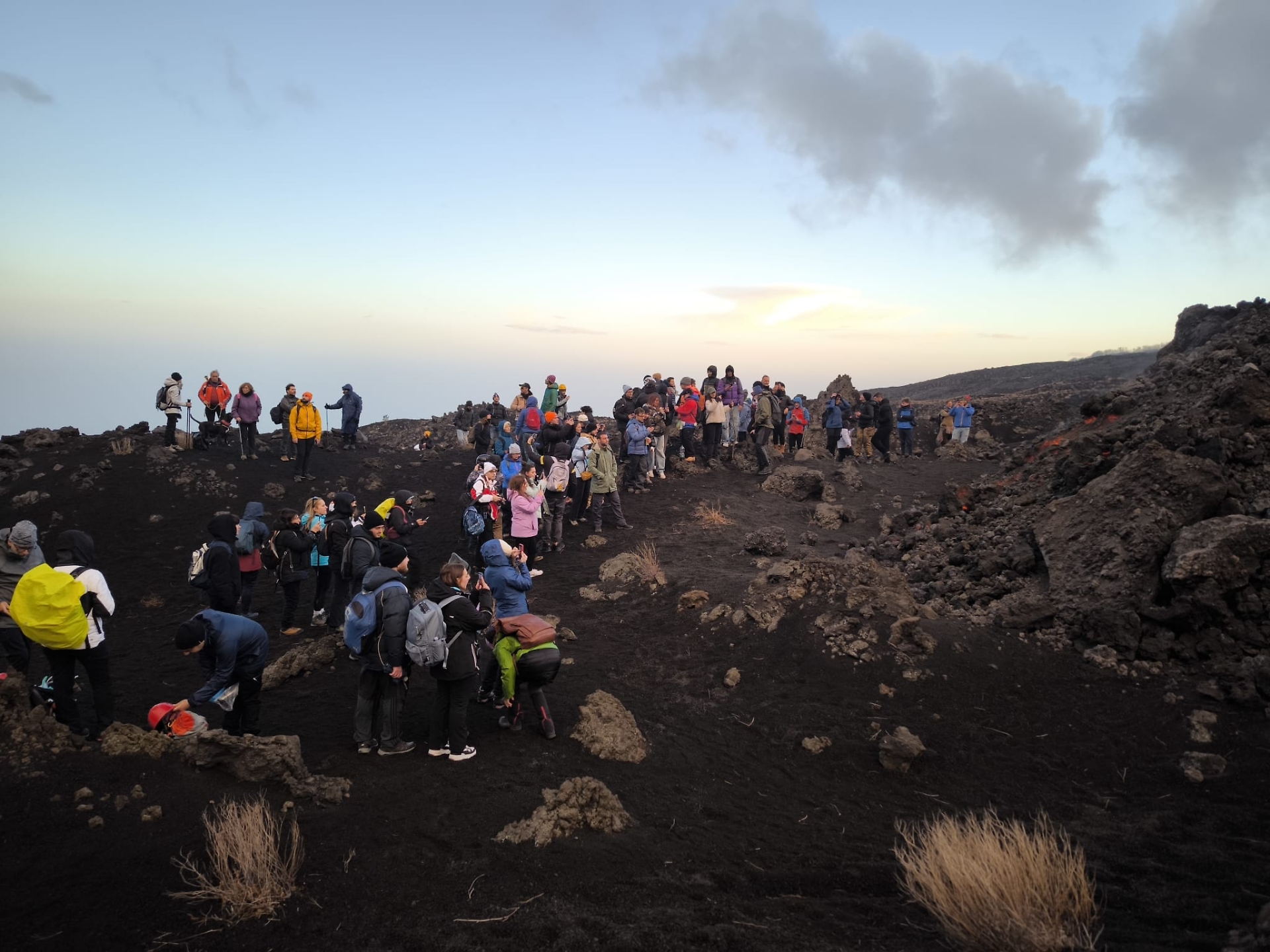 La risposta è stata il fai da te: approfittando della giornata festiva, in centinaia si sono comunque avventurati attraverso la valle del Bove. «Abbiamo seguito le orme sulla sabbia, i fumi della colata e le nostre guide "pezzotte"», racconta una ragazza che arriva da Patti insieme ad altri amici, dove quelli con più esperienza provano a dare le indicazioni. Di giorno è tutto abbastanza semplice. Oggi non c'è neve. La lava avanza lentamente su un terreno pianeggiante e sabbioso. Le esplosioni idromagmatiche che nascono dall'interazione tra acqua e fuoco e impongono di mantenere una distanza di sicurezza maggiore, in questo scenario non esistono. Il rischio maggiore è il freddo per chi - e sono molti - non è ben attrezzato.