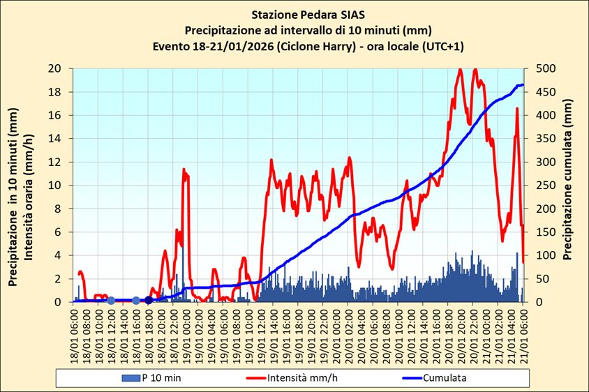 «Nei giorni del passaggio ciclone Harry In Sicilia ha piovuto tanto. La stazione Sias Pedara (Catania), a 803 metri di quota altimetrica sul versante Sud-Sud-Est dell’Etna, operativa dal 2002, ha superato i precedenti record di accumulo pluviometrico in 48 ore e in 72 ore registrati durante la sua attività. È stato registrato un accumulo di 466,6 mm in 72 ore dalle 5 del 18 gennaio alle 5 del 21 gennaio; il record precedente di 386,6 mm risaliva all’evento del 22-24 dicembre del 2006».