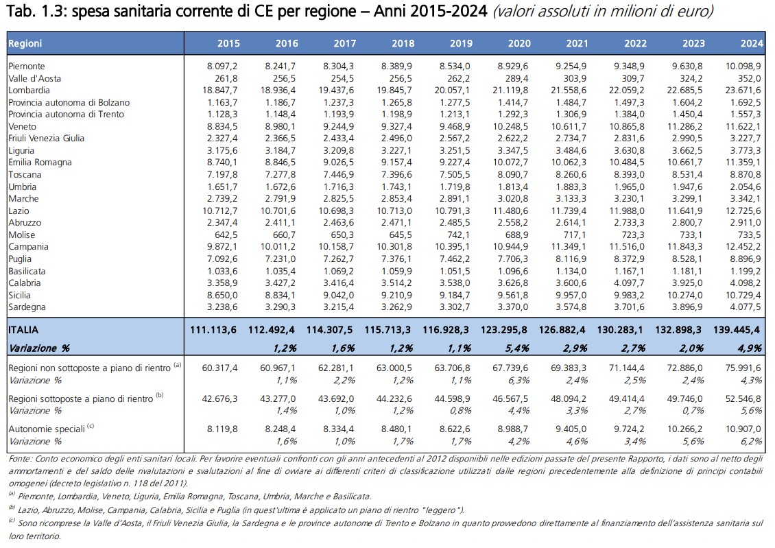 Per la sanità italiana è arrivato il rapporto della Ragioneria generale dello Stato sulla spesa. Nel 2024 la spesa pubblica ha toccato quota 139,4 mld (+4,9% rispetto al 2023), di cui 10,7 miliardi in Sicilia (spesa in aumento di 500 milioni sul 2023). A queste spese vanno sommati altri 46,4 mld di spesa out of pocket (+7,7%) da parte dei cittadini, per arrivare alla cifra di quasi 186 miliardi di euro. A crescere sono soprattutto le voci relative al personale (+4,6%), farmaceutica diretta (+11,8%), beni e servizi (+9,3%), farmaceutica convenzionata (+3%), assistenza medico-generica (+3,5%) e acquisti da privato (+1,9%). Parallelamente, aumenta la spesa a carico diretto dei cittadini, che nel 2024 ha raggiunto livelli record pari a 46,4 miliardi: la spesa sanitaria privata presenta una variazione del +7,7% rispetto ai valori dell'anno precedente.