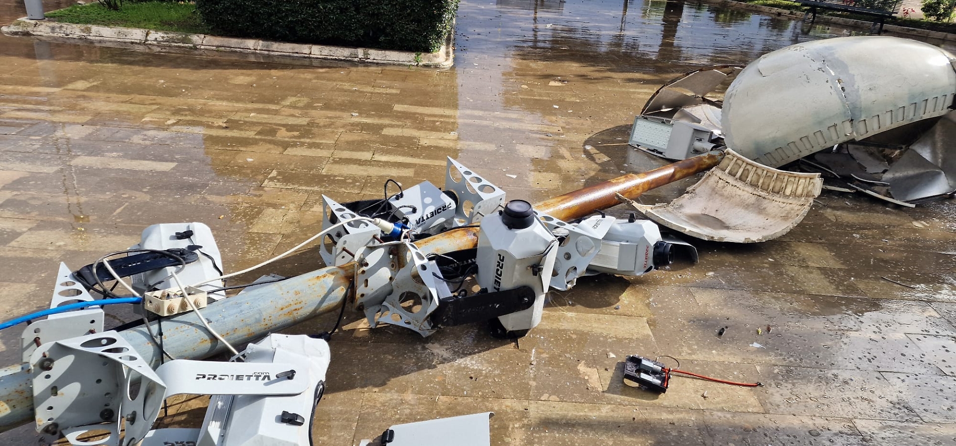 Il cedimento ha provocato danni agli impianti presenti sul palo: sono state gravemente danneggiate le telecamere di videosorveglianza installate a metà altezza oltre ai vari proiettori che illuminavano la facciata del Municipio. Vigili del fuoco e polizia municipale hanno transennato la zona.