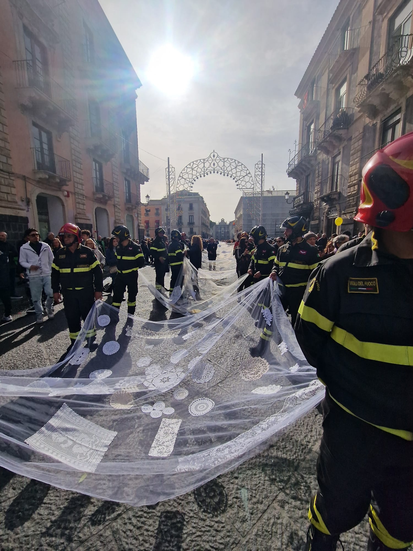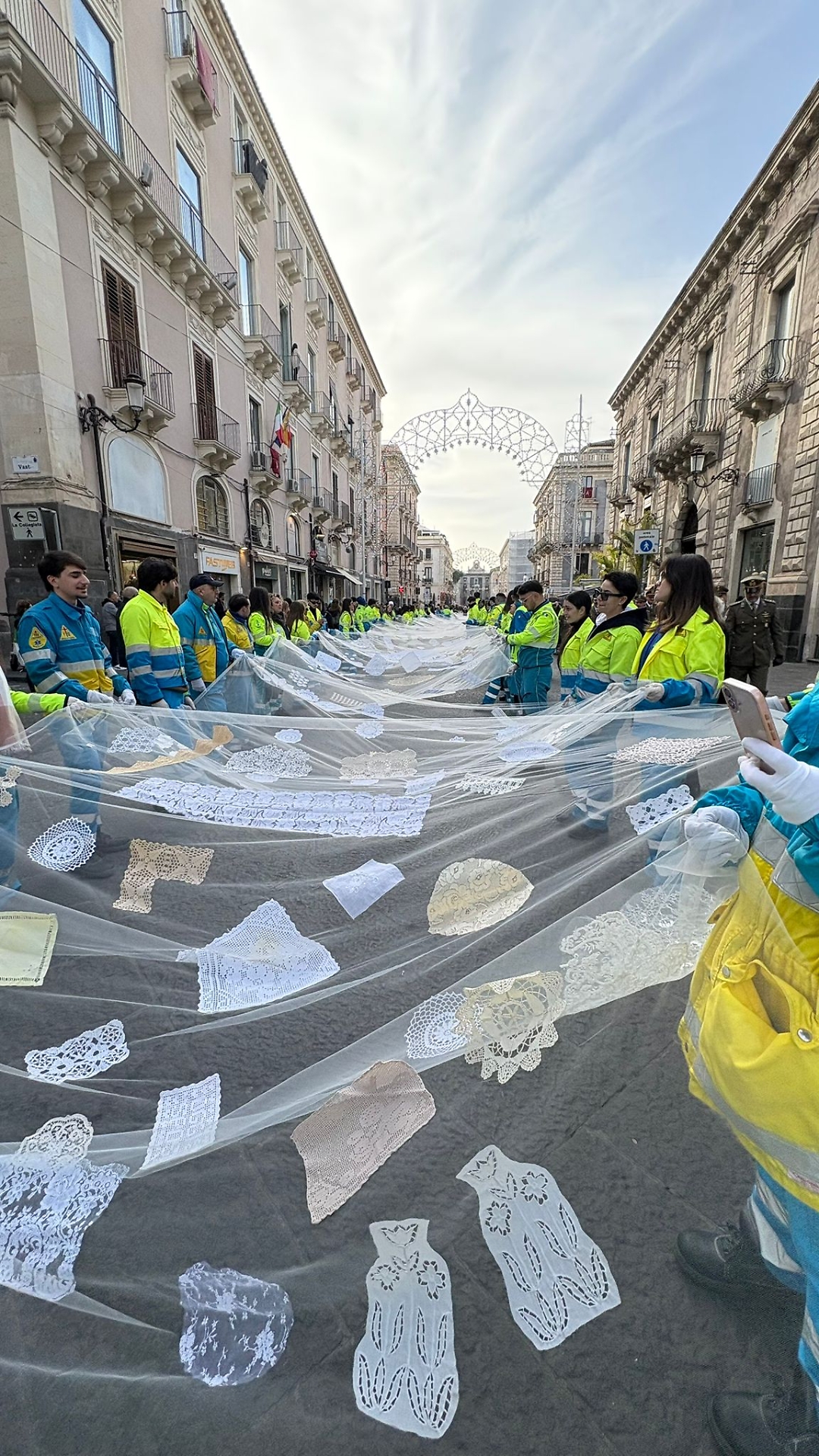 Un velo, lungo poco meno di un chilometro, su cui sono stati applicati pizzi e merletti, donati da tante persone "che raccontano storie di famiglia, memorie, tradizioni e legami con Sant'Agata, spesso legati all'antica tradizione della dote", come spiega lo stesso artista.