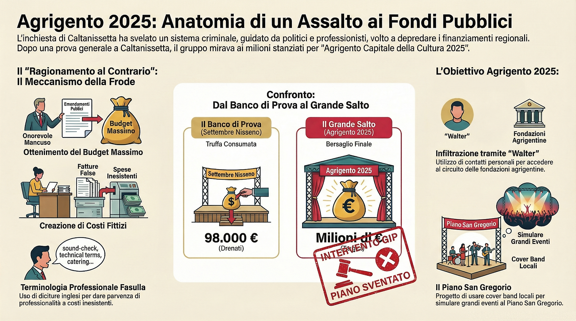 L'inchiesta nissena che ha portato il deputato regionale Michele Mancuso ai domiciliari scoperchia il vaso di Pandora di un collaudato sistema di malaffare politico-affaristico. I 98 mila euro drenati per il Settembre Nisseno erano solo un banco di prova. Le intercettazioni svelano l'assalto imminente al tesoretto milionario di Agrigento Capitale della Cultura 2025. Tra "amici" nelle fondazioni, location esclusive e la promessa di "trasferirsi alle Maldive", ecco come la Capitale della Cultura rischiava di trasformarsi nella Capitale della Truffa.