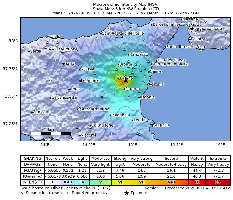 Il primo evento registrato, il più forte, alle 7.05 di magnitudo 4.5. Nel Comune ai piedi dell'Etna i danni più ingenti