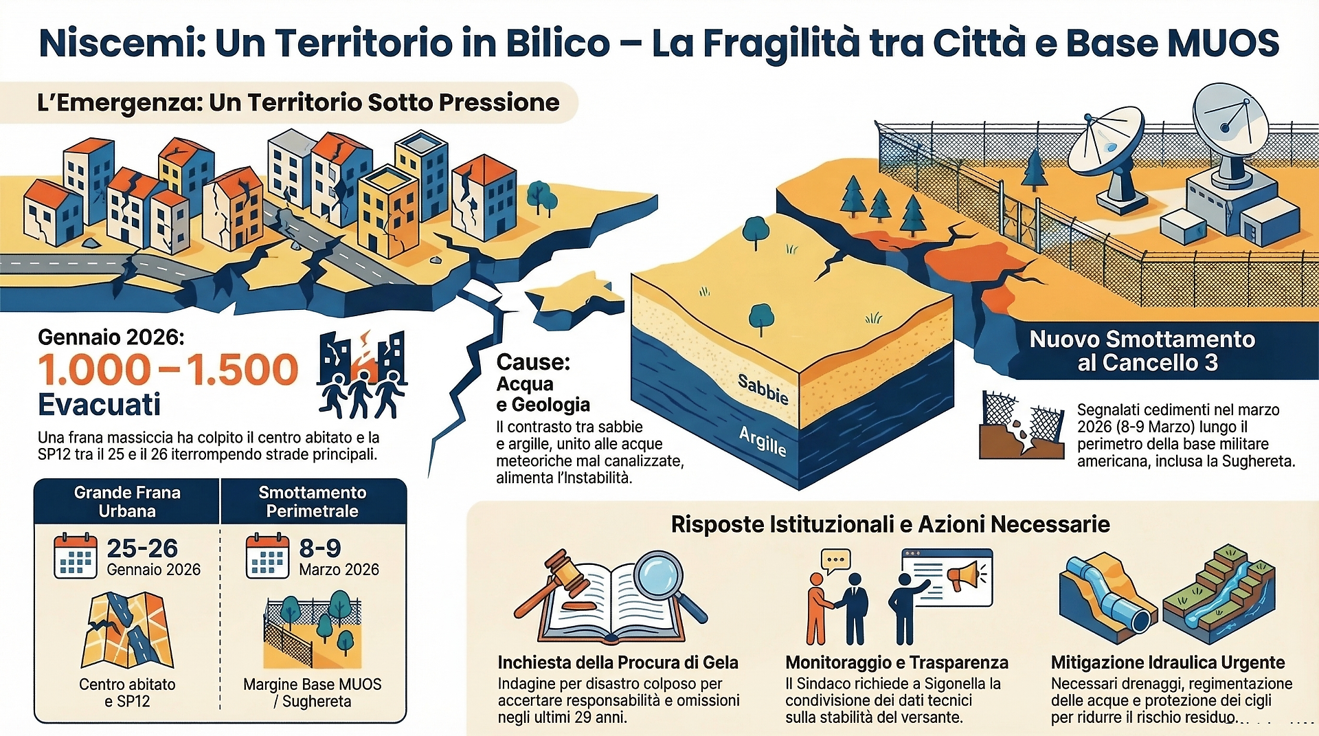Sotto il profilo geomorfologico, questo nuovo smottamento periferico non è affatto marginale, ma va interpretato come un campanello d’allarme. La corposa relazione — oltre 150 pagine — redatta dall’Università di Firenze per la Protezione civile descrive la collina di Niscemi come un sistema interconnesso ed estremamente fragile. Gli studiosi individuano nel contrasto di permeabilità tra sabbie e argille, e nell’incanalamento delle acque meteoriche e urbane nel torrente Benefizio, le cause di uno scivolamento che, nella fase più acuta, ha toccato la velocità di un metro l’ora.