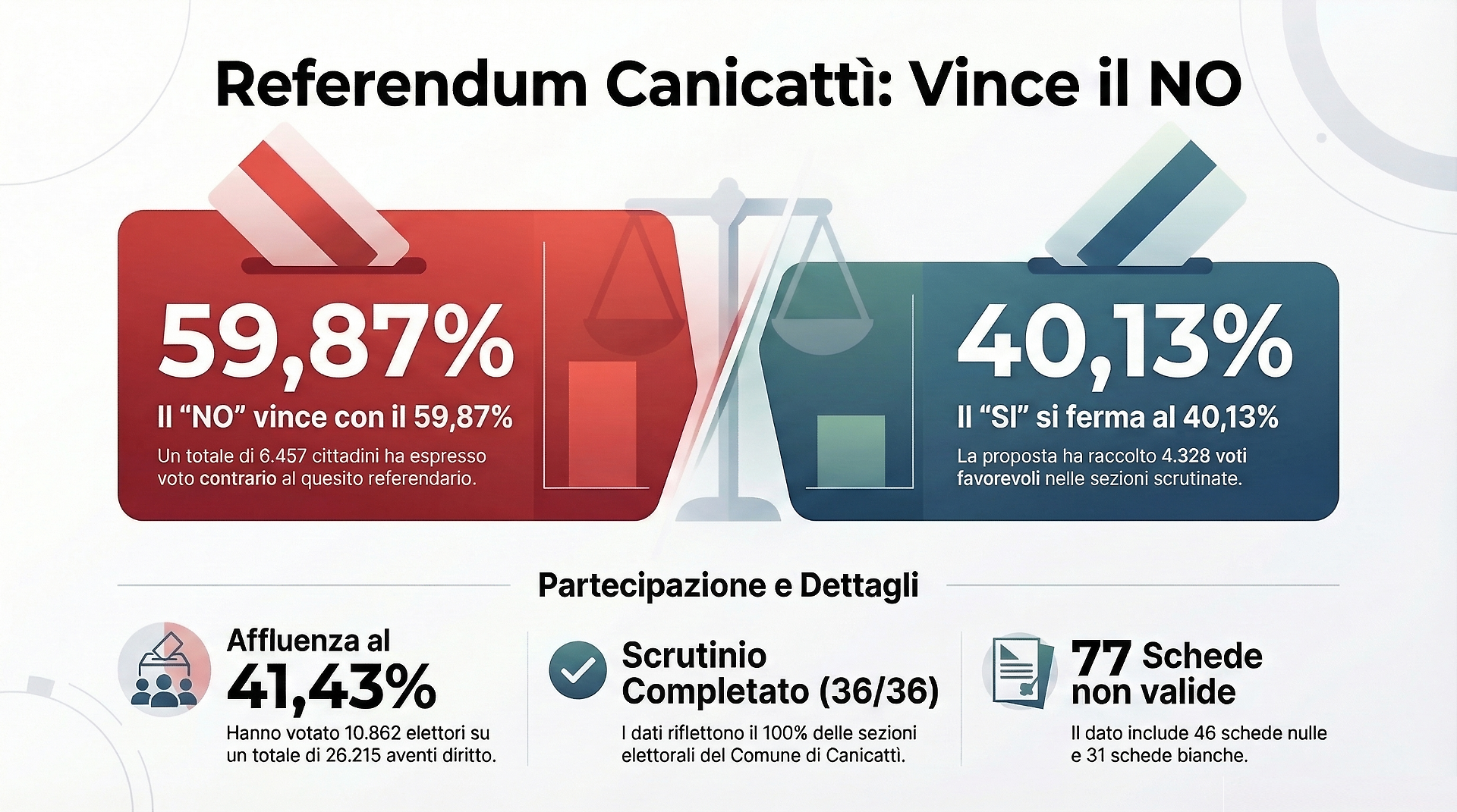 I dati ufficiali dopo lo scrutinio di tutte le 36 sezioni, delineano un quadro inequivocabile. I contrari alla riforma hanno totalizzato 6.457 voti, pari al 59,87%. Il “SÌ” si è fermato a 4.328 preferenze, corrispondenti al 40,13%.