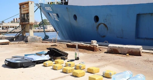 Dieci involucri di colore giallo, disposti su due file a terra davanti a una nave che ha il nome "Medinea", lo stesso di quella sequestrata dai libici di Bengasi e il cui equipaggio, insieme a quello del peschereccio "Antartide", è da 22 giorni nelle mani del generale Khalifa Haftar.
