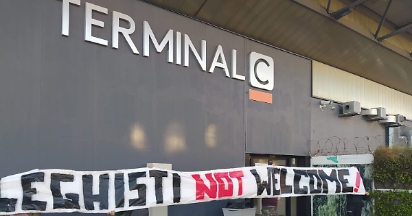 Stamattina sono stati esposti striscioni con la scritta "Leghisti not welcome", davanti ai principali ingressi dell'aeroporto. Il messaggio - si legge in una nota - è rivolto agli uomini che Matteo Salvini ha chiamato a raccolta sui suoi canali social in occasione del processo.