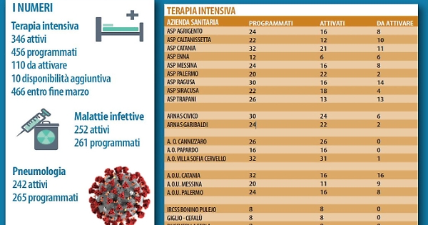 I 110 posti certi, che poi corrispondo a quelli non attivati rispetto alla mappa del decreto assessoriale del gennaio 2019, sono così distribuiti negli ospedali di competenza delle Asp: 8 ad Agrigento, 10 a Caltanissetta, 11 a Catania, 6 a Enna, 8 a Messina, 2 a Palermo, 14 a Ragusa, 4 a Siracusa, 13 a Trapani. Per il resto, gli incrementi più significativi saranno nelle strutture che fanno capo ai Policlinici universitari: 16 a Catania, 9 a Messina e 8 a Palermo. Gli altri aumenti: 7 a Palermo (6 al Civico e 1 al Villa Sofia-Cervello), 2 a Catania (al Garibaldi) e 4 all’Ismett.