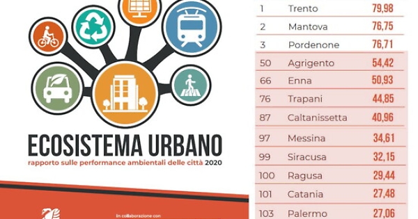 Come al solito la Sicilia fa una pessima figura nel rapporto di Legambiente 2020 sulle performance ambientali delle città italiane sui dati del 2019, in collaborazione con Ambiente Italia e Il Sole 24 Ore, quest'anno giunto alla sua 27 edizione senza che negli anni l'Isola riuscisse a migliorare le sue performance. Dagli anni Novanta lo studio compara gli indicatori di 104 comuni capoluogo italiani, basandosi su 18 parametri raggruppati in 5 macroaree (aria, acqua, rifiuti, mobilità ambiente) e la Sicilia si conferma in fondo alla classifica se si escludono Agrigento, Enna e Trapani che in qualche modo riescono a uscire dai bassifondi e a ritagliarsi - grazie ad alcuni indicatori - piccoli spazi vicini a metà graduatoria.