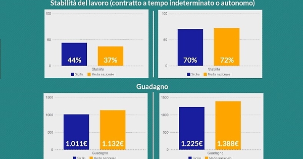 La metà degli studenti siciliani che riescono a conseguire una laurea triennale riesce dopo un anno a trovare un lavoro (considerando anche la formazione retribuita), mentre il 38% è disoccupatro considerando coloro che sono inseriti o intendono farlo nel mercato del lavoro. Il 46% degli occupati può contare su un lavoro stabile, ossia contratti a tempo indeterminato o attività autonome effettive (liberi professionisti, lavoratori in proprio, imprenditori e guadagna in media 985 euro mensili netti.