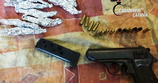 Ispezionando gli altri veicoli posteggiati nelle vicinanze, dietro la ruota posteriore di una Fiat 600, anch’essa già sequestrata ed abbandonata in strada – di proprietà di un pregiudicato - è stata rinvenuta una pistola cal. 7.65 con la matricola abrasa, il serbatoio vuoto inserito e 14 cartucce del medesimo calibro, avvolte in un involucro posto vicino l’arma. La pistola, come da prassi consolidata, sarà inviata al R.I.S. di Messina per gli opportuni esami tecnico-balistici che potrebbero stabilirne l’eventuale utilizzo in pregressi episodi criminosi. La droga è stata sequestrata mentre il minore è stato accompagnato nel centro di prima accoglienza del Tribunale per i minorenni di Catania.