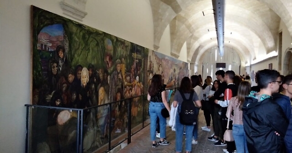MATERA, 12 OTT - I volti contadini del telero "Italia 61" di Carlo Levi a Palazzo Lanfranchi e quelli dei bassorilievi policromi delle opere in cartapesta dell'artista spagnolo Josè Ortega, nella "Casa" dei rioni Sassi, fino alle immagini dell'arte ispanica negli Ipogei Motta: sono alcuni dei 14 luoghi e attrazioni aperti a Matera, Capitale europea della cultura 2019, per le Giornate Fai d'autunno. Ad apprezzarli sono i numerosi turisti, molti dei quali stranieri, accompagnati da ciceroni in erba delle scuole medie superiori e inferiori. Come ha fatto una coppia di ragazzi agli ipogei Motta, vestiti in abiti tradizionali.