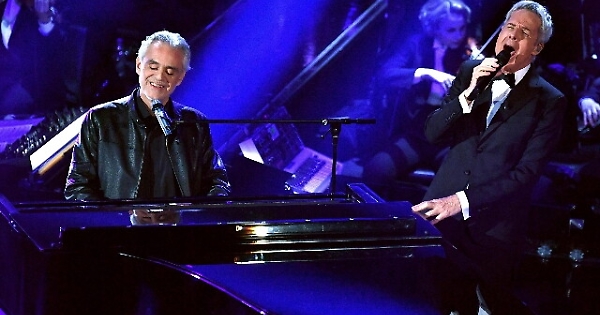 SANREMO, 5 FEB - La standing ovation premia Andrea Bocelli come 25 anni fa, quando il tenore vinse Sanremo Giovani con Il mare calmo della sera. E stasera emoziona l'Ariston riproponendo il pezzo - che esalta anche l'orchestra - in duetto con Claudio Baglioni. Al piano, il chiodo nero che indossava allora e che poi cede al figlio Matteo: "Non è un passaggio di testimone - dice Bocelli al figlio - ma è un augurio. Sono sicuro che ti porterà fortuna sempre che la aiuti con la serietà, la volontà, lo spirito di sacrificio che spero di averti insegnato". Poi il duetto con Matteo sulle note di Fall on Me.