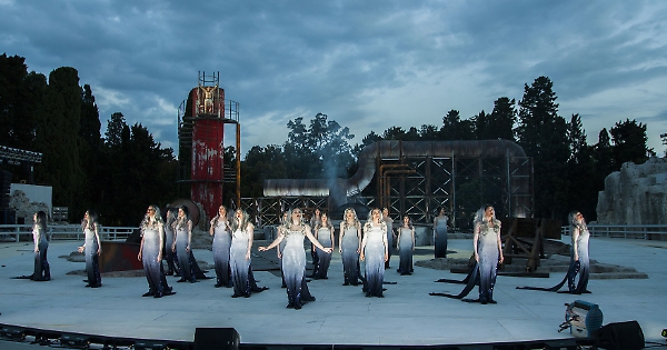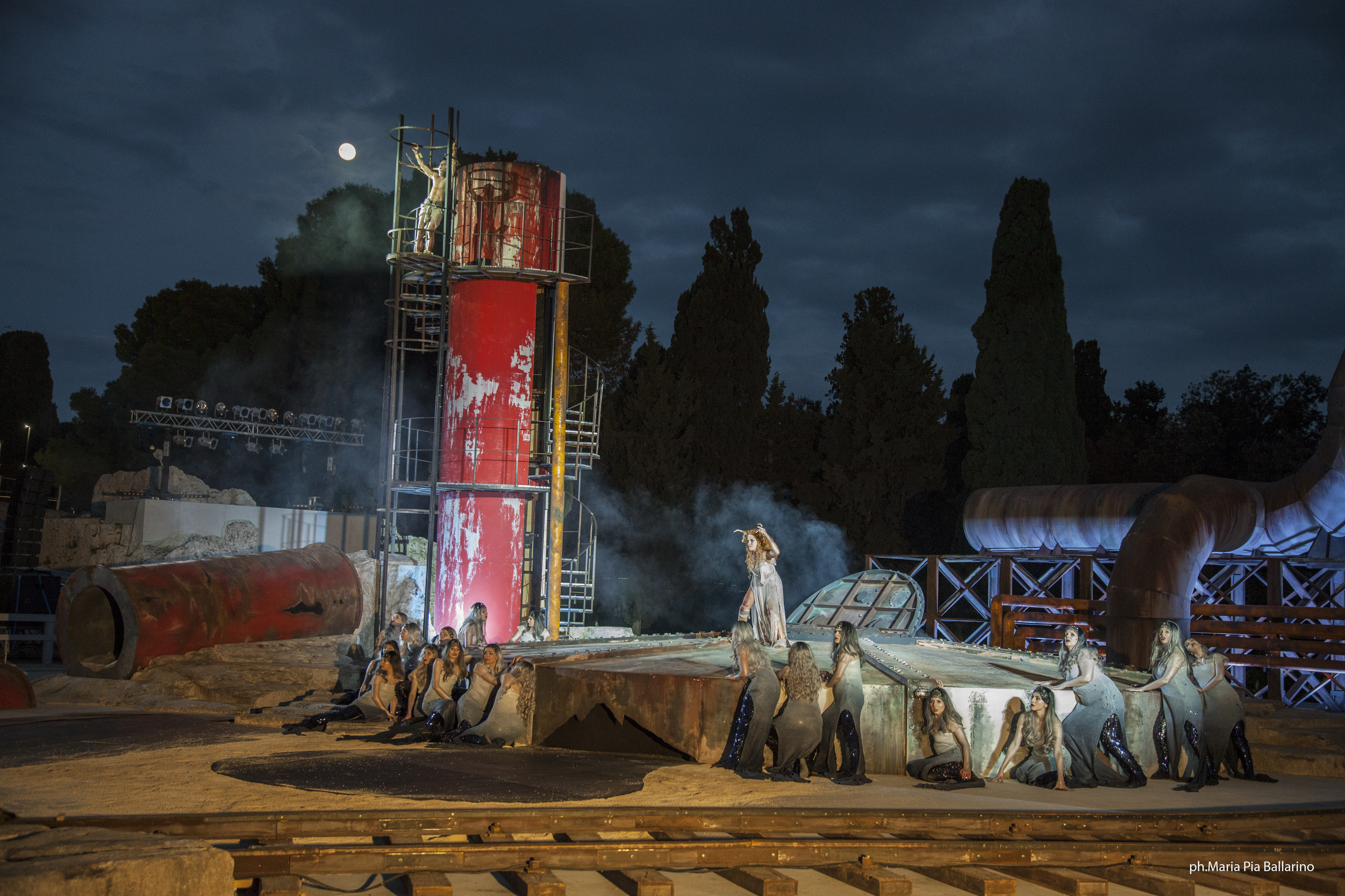 Regista a tutto tondo, noto per gli allestimenti d’opera alla Scala, Leo Muscato sceglie di incatenare Prometeo non a una rupe ma a una ciminiera. Nessun riferimento a paesaggi industriali a noi vicini, sottolinea. Di ciminiere in solitudine verso il cielo è, purtroppo, pieno il mondo. «Il testo parla di archetipi, non di quotidianità – spiega il regista – Volevo un luogo simbolico che subito, visivamente, indicasse la deriva dell’uso della tecnica. Un sito industriale in disfacimento, con un treno su un binario morto, di quelli che portavano ai campi di concentramento, e le Oceanine escono da una cisterna sporche di petrolio. Siamo alla fine del mondo». Prometeo, il ribelle che sfida Zeus, entra in scena in trascinato da Cratos e Bia, il potere e la violenza. «E’ la dittatura degli arroganti che arrivano al potere sbaragliando tutto quello che c’era prima», anticipa il regista.