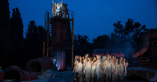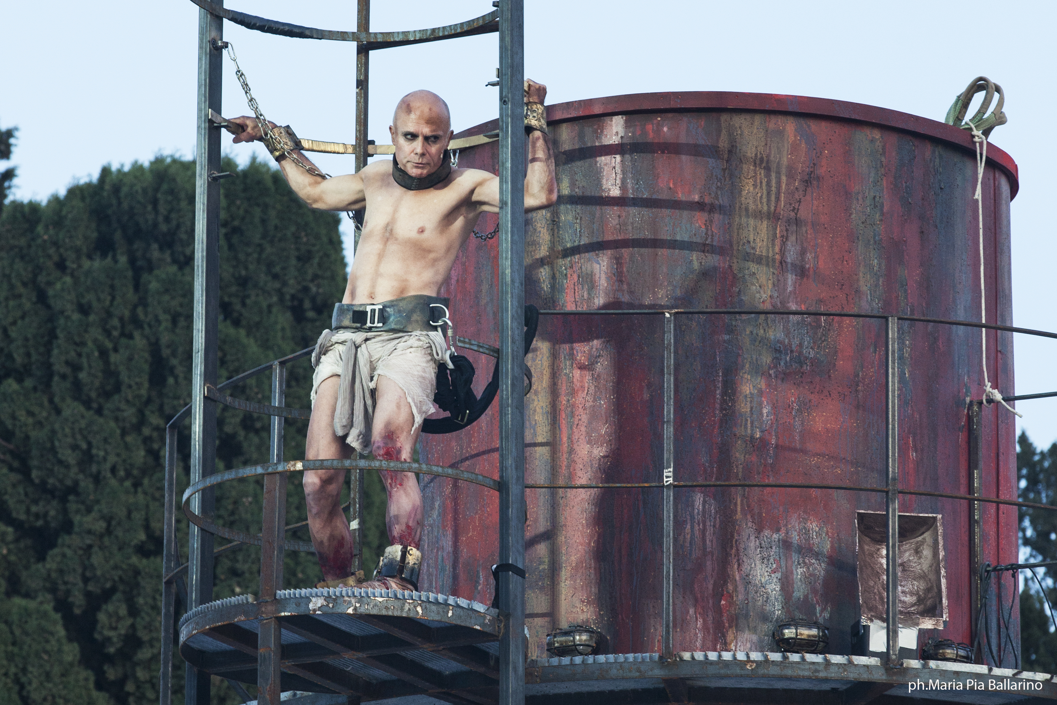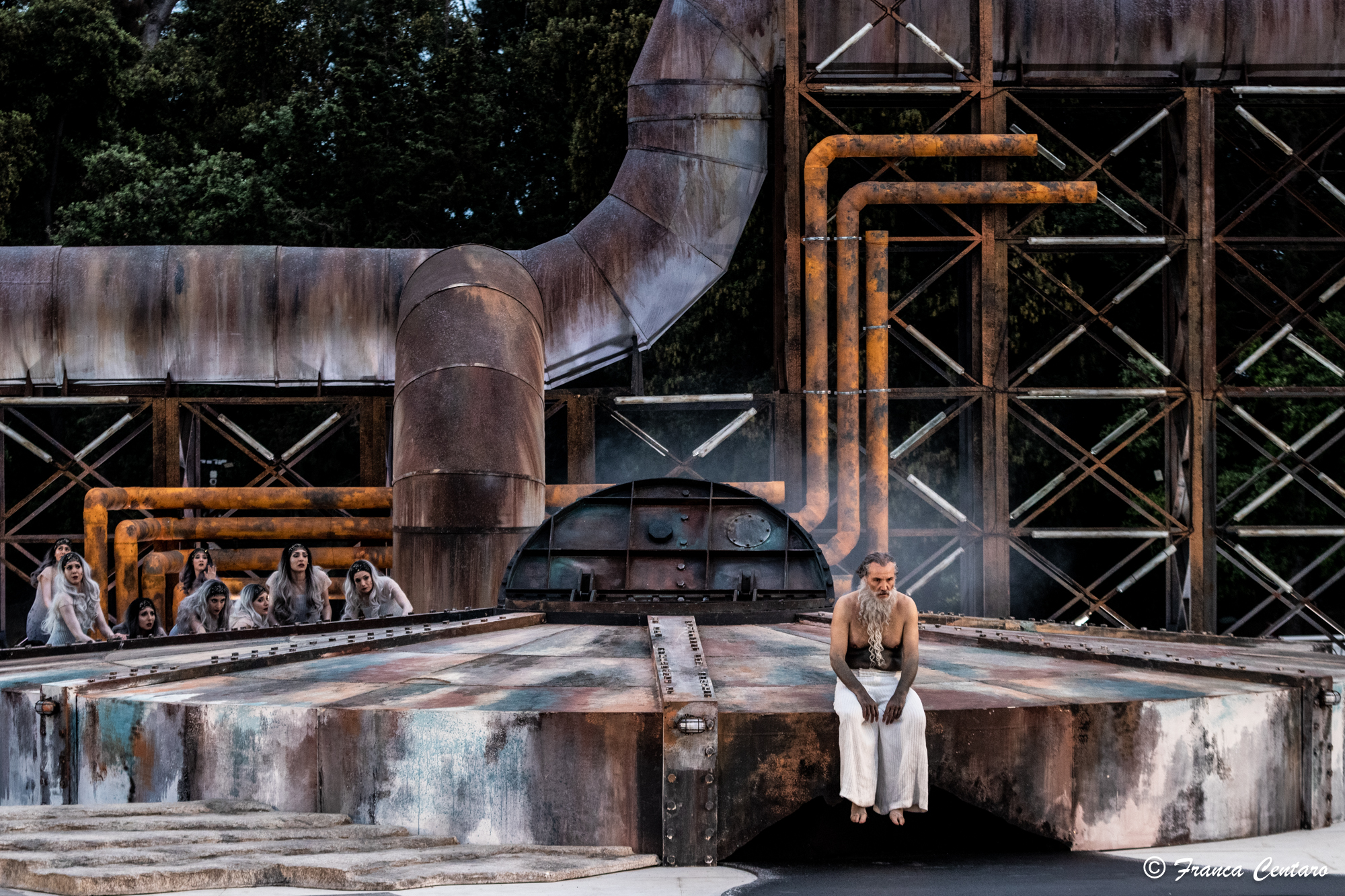 Il rumore d’una cancellata sgangherata spezza i timpani ma è incredibilmente solenne ché, a modo suo, promette una “azione” che in “Prometeo incatenato” di Eschilo - apertura di stagione dell’Inda al Teatro antico di Siracusa fino al 4 giugno, regia di Leo Muscato, nell’italiano snello di Roberto Vecchioni, teatrale quanto basta nel contributo di Francesco Morosi - l’azione, dunque, sembra negarsi. E’ una stasi apocalittica e riarsa. Ruggine come erba. Dappertutto. E’ sulla ciminiera a cui è incatenato il titano, mortifica un sofisticato “reame” industriale che fu, ne è incrostata una cisterna. E poi quel binario morto, vivissimo nelle minacce dei “missi dominici” del potere - Kratos, Bia, Efesto, Oceano, Hermes - per cui Prometeo è diventato uno scandalo.