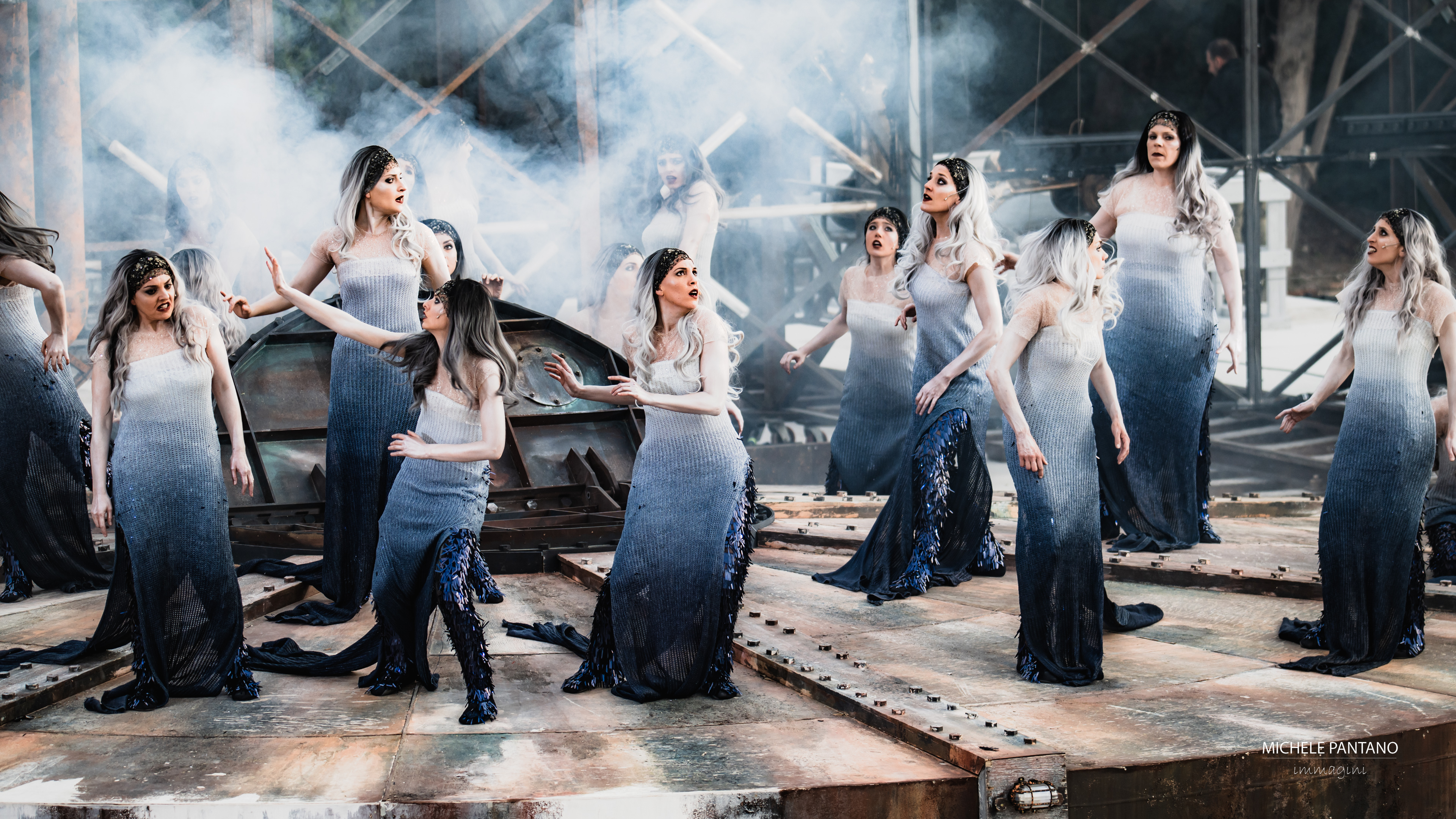 L’impatto scenico di Deniz Ozdogan-Io è intenso: fisicità prepotente, canto vero innestato in una recitazione che sa un po’ di Ronconi e un po’ d’enfasi “antica”. E’ l’unica umana della tragedia ma, ahimè, dotata di corna bovine perciò sfiata e piange, parla e mugghia: la sventurata Io di Deniz è sanguigna, veemente, donativa e d’effetto è l’uscita di scena, arrampicata stancamente sui gradini della cavea. Non senza aver “mimato” la sua futura sorte d’affrancamento dall’Olimpo su corpi (e teste) delle Oceanine. Che sono francamente un gran bel colpo d’occhio, con catturanti “fermo-immagine”, coreuticamente e coreograficamente (Nicole Kehrberger) efficaci nella loro “mise” di donna-pesce (costumi appropriatissimi, tutti, questi più che mai, di Silvia Aymonino), pantaloni d’argento e leggera veste nera dalla lunga coda, di pesce, appunto. Impegnate musicalmente in interventi che danno un’idea di canto “a cappella” con un basso continuo da Carmina burana, sono governate da Elena Polic Greco, in scena con loro, e “arricchite” dalle allieve dell’Accademia del Dramma Antico. Fermo, riottoso, spezzato, “animoso”, dice la traduzione.