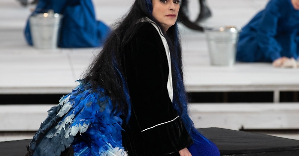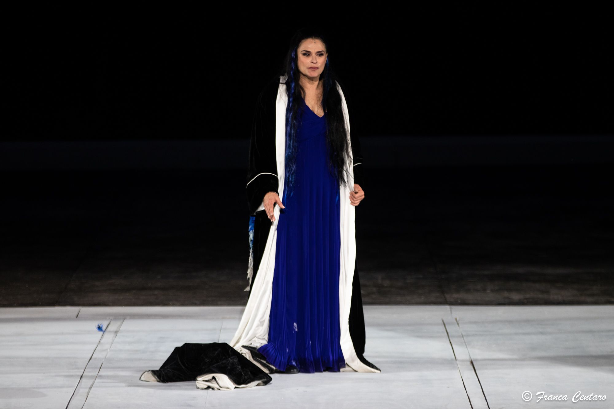 Da che la sappiamo tragica (Clitemnestra, Elena, Giocasta, precedenti brillanti e tonanti) lei fa lo spettacolo, ne dà ragione, sentimento, prospettiva, lo rende atemporale e archetipico perché è “attore” di modernità inchiodante. In un contesto di sapore scandinavo si sarebbe tentati dal ribattezzarla Hedda Gabler ma perché mai? Lei sfugge a tempi e categorie, ha un vigore che non conosce schemi e date. Presente ed “antica” nella stessa misura in cui il Mito è ancora in grado di comprometterci, tutti. Sicché resta Medea, inequivocabilmente e a suo modo. Per questo (i costumi di Giovanna Buzzi confermano che l’abito “fa” il monaco, eccome!) non può esservi epoca nella veste, incantevole, sottana bluette e manto con lungo strascico istoriato, copricapo con becco d’uccello, terribile e temibile come la voce ancora fuori campo.