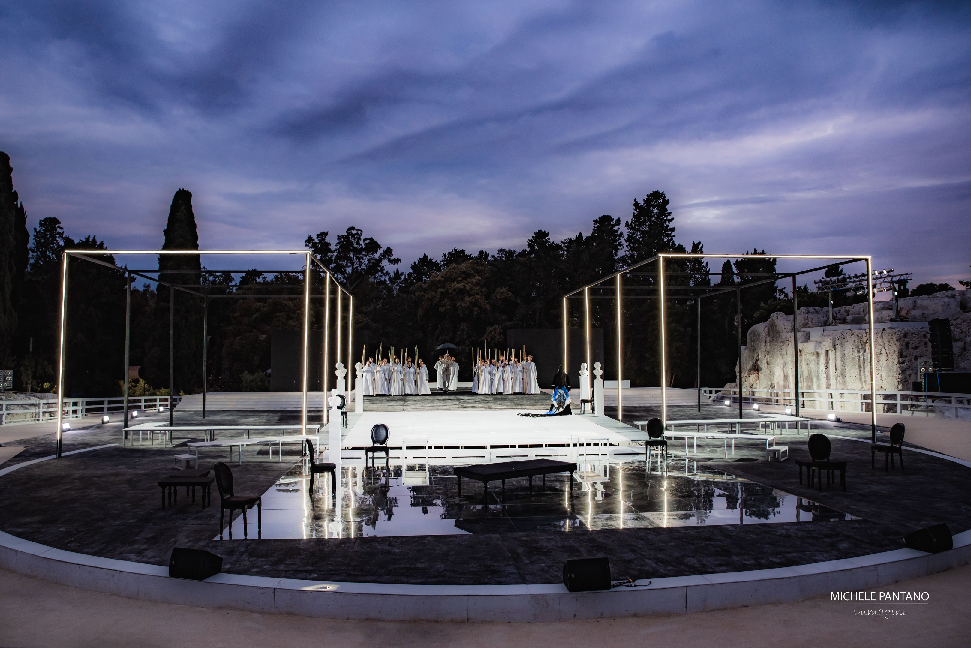 Regista sensibile, colto, accorto, raffinato, Tiezzi ne ha fatto trasparente dichiarazione d’intenti: nessuna meraviglia, dunque, segno di coerenza, piuttosto, se la scena di Marco Rossi, di magnifica profondità, è punteggiata da elementi di salotto borghese a cavallo tra XIX e XX secolo. In bianco e nero, poltroncine, lunghi tavoli, pavimento a specchio, il “salon” è perimetrato da ideali sale vuote e senza soffitto.