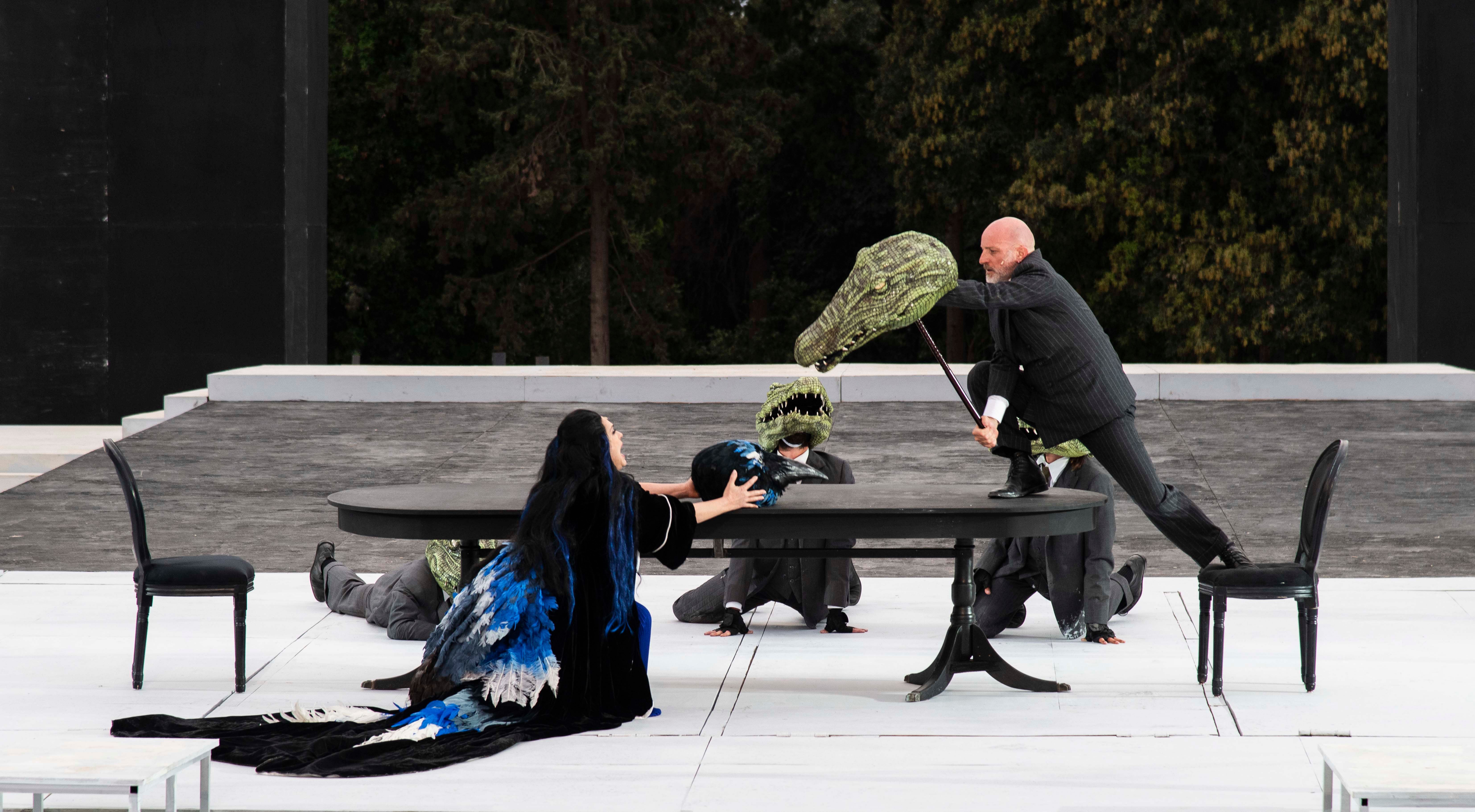 Alita un Novecento d’Europa del nord. Veste di bianco cechoviano, Egeo, la nutrice (Debora Zuin) sfoggia un italiano “esotico” che rammenta decisamente Charlotte, governante nel “Giardino dei ciliegi”; in Giasone, elegantemente conciato da perfetto direttore di banca senza scrupoli, si riconosce all’istante John Gabriel Borkman di Ibsen. I bambini suoi e di Medea (Francesco Cutale, Matteo Paguni), che, guardati a vista dal precettore (Riccardo Livermore), giocano con teste di conigli peluche, sembrano ritagliati da un dramma di Giacosa e, perché no, persino da “Fanny e Alexander” di Ingmar Bergman. Chissà che a rappresentare il ‘900 peggiore non sia Creonte-Roberto Latini: un “burosauro” seguito da dignitari-galoppini con testa di coccodrillo (lui se la sfila giusto per intimidire e intimidare Medea), parla da tribuno.