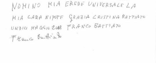 Dopo due anni dalla sua morte spunta un testamento olografo di Franco Battiato. Un bigliettino in cui l'artista avrebbe scritto le sue volontà (pubblicato dal sito Open), una breve nota di tre righe a stampatello, carattere che non usava mai, e firmata Franco, non con il suo nome per esteso, Francesco, in cui lascia tutti i suoi beni alla nipote. “Nomino come mia unica erede la mia cara nipote Grazia Cristina Battiato. 11 maggio 2018. Franco Battiato”. La nota è stata autenticata a Milano il 30 giugno 2021 dal notaio Alessandro De Cicco dopo la richiesta della stessa nipote di Battiato, un mese e mezzo dopo la morte del cantante l'11 maggio 2021.