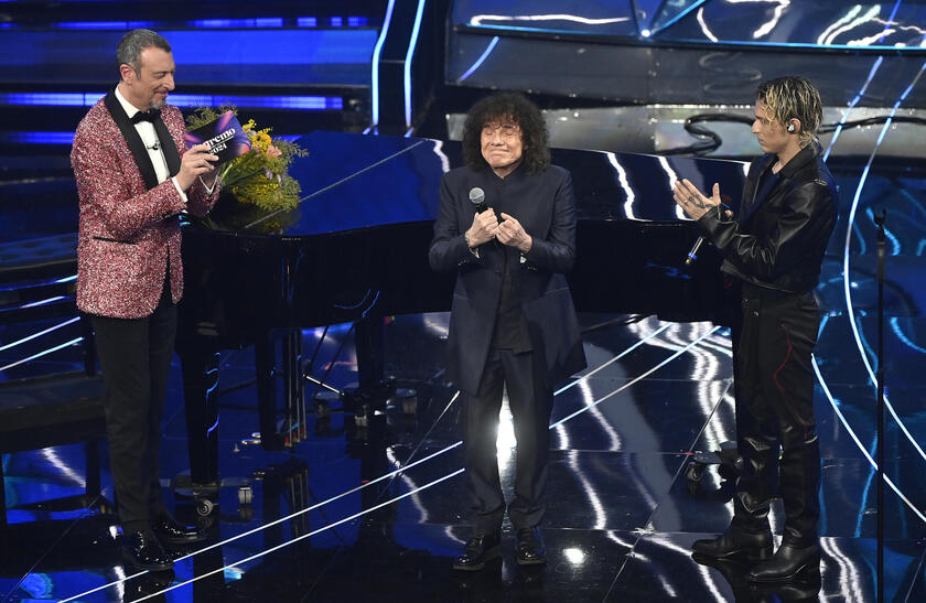 FIORELLA MANNOIA con FRANCESCO GABBANI - Che sia benedetta/Occidentalìs Karma - 6,5 L'autoironia è la chiave di questo duetto, che riporta all’Ariston la sfida del 2017, vinta da Gabbani e dalla scimmia che lo accompagnava ai danni di Fiorella. Il cantautore replica anche l’inchino dell’epoca. Alla fine né vincitori né vinti.