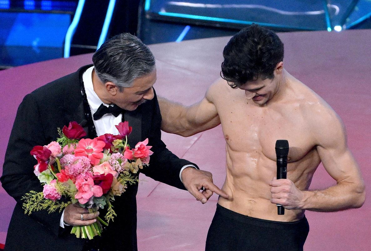 Per chiudere il suo ultimo festival Amadeus ha voluto accanto a sé ancora l’amico Fiorello: dopo le ore piccole con Viva Rai2! e le incursioni all’Ariston, lo showman si prende il palco con una rivisitazione dell’Uomo in frac su un mash-up tra Domenico Modugno e Billie Jean di Michael Jackson, con un costume luminoso dagli inserti led, con i ballerini della Compagnia ucraina di danza hi tech di Kiev. «Per fare questo numero sono stato in carica tutto il pomeriggio», scherza Fiore.