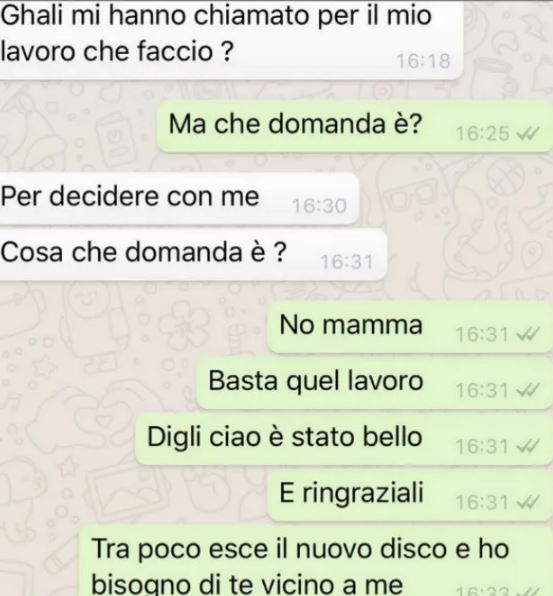 Ciao mamma ora puoi stare tranquilla, non sono mai stato il primo della classe, però sono ora il primo in classifica. E questa vittoria la dedico a te. Abbiamo dormito nella stessa stanza, sullo stesso letto, uno a fianco a l’altro fino ai miei 23 anni, fino a quest’estate, e questa musica mi aiuta a non vergognarmene. Ti ho messo nella copertina del mio singolo più importante perché me lo ero promesso da quando ero piccolo, da quando andavamo a trovare papà ai colloqui e vi baciavate mentre io disegnavo. – Ghali