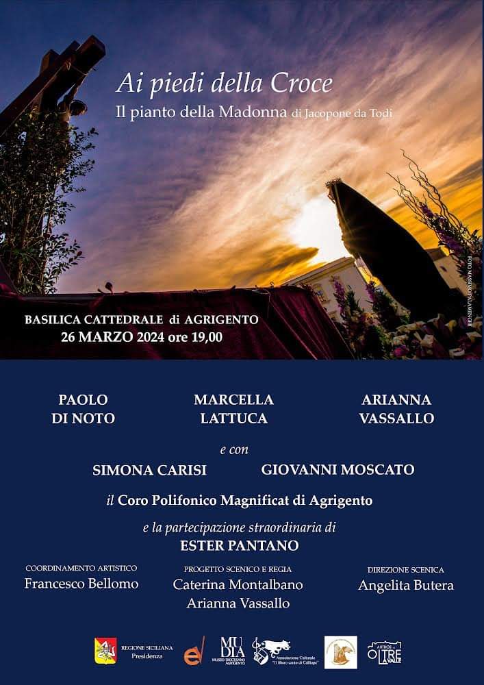 "Ai piedi della Croce. il Pianto della Madonna”, di Jacopone da Todi. Un evento che vedrà coinvolti numerosi artisti agrigentini si svolgerà nella Cattedrale di Agrigento, martedì 26 marzo alle ore 19,00 e prevede vari momenti di arte, recitazione e musica. Prevista la partecipazione straordinaria di Ester Pantano, l’attrice catanese reduce dai successi con il Commissario Montalbano e soprattutto Makari.