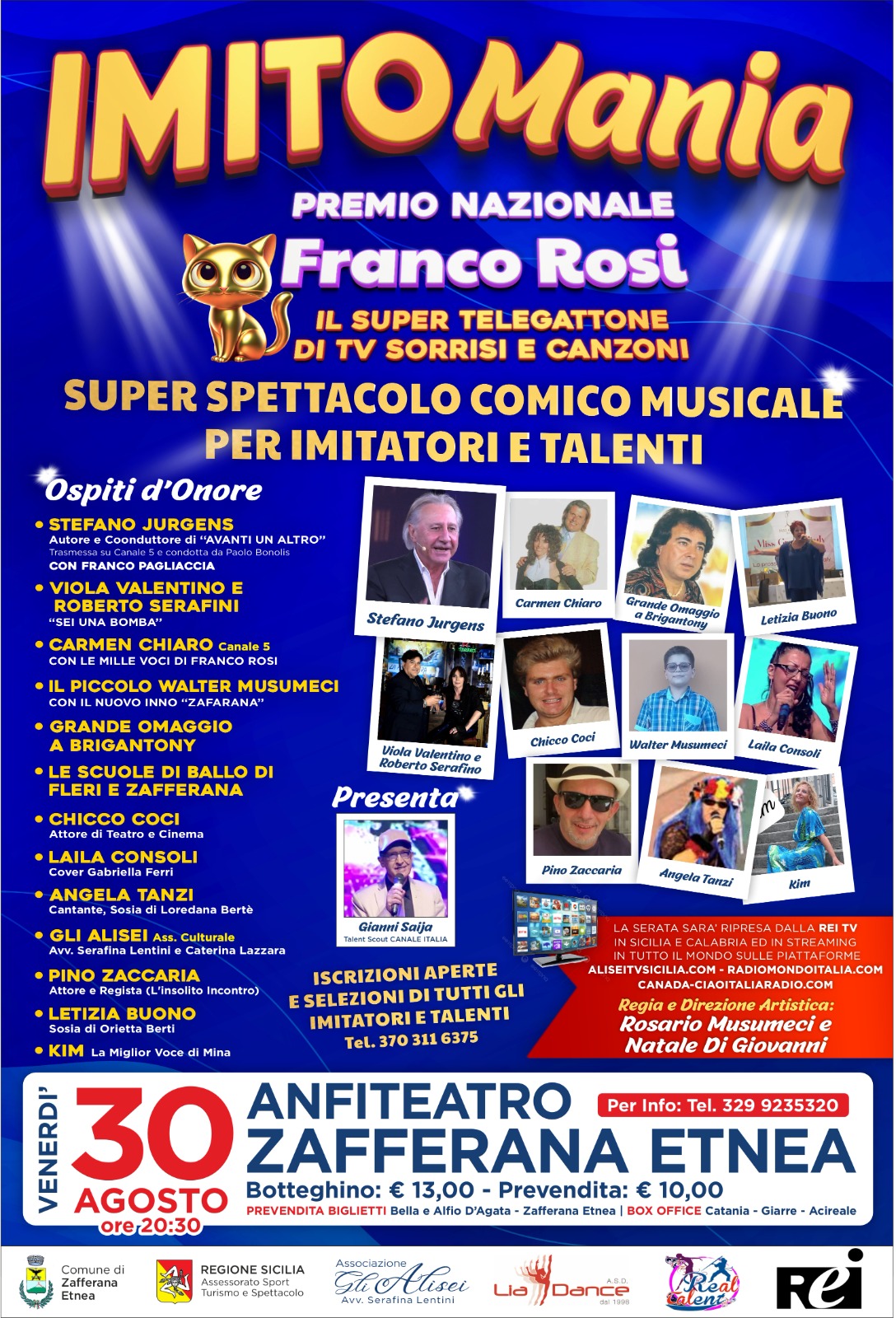Dopo il successo dello scorso anno il prossimo 30 agosto alle ore 20,30 al Teatro Falcone e Borsellino di Zafferana Etnea, nell’ambito della kermesse “Etna in scena” ritorna la seconda edizione di “Imitomania- Premio nazionale “Franco Rosi”  organizzata dall’Associazione Alisei, per la regia e la direzione artistica di Rosario Musumeci e Natale Di Giovanni.