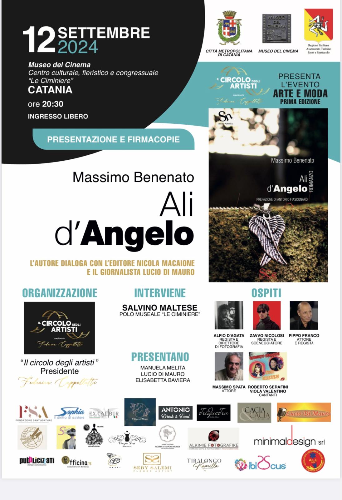 Domani, giovedì 12 settembre, alle ore 20.30, l’anfiteatro delle Ciminiere diventerà il palcoscenico di “Arte e Moda”, evento a ingresso libero patrocinato dalla Città metropolitana di Catania ed organizzato dal Circolo degli Artisti, presieduto da Federica Cappelletti. Il momento nodale della serata sarà la presentazione e firmacopie del libro “Ali d’Angelo”, ultimo romanzo dello scrittore Massimo Benenato, figlio dell’indimenticato attore cinematografico Franco Franchi. Con l’autore dialogheranno l’editore Nicola Macaione e il giornalista Lucio Di Mauro. Il romanzo, come scrive in prefazione Antonio Fiasconaro, indaga il rapporto uomo donna nelle sue sfaccettature più varie, profonde ed intime, talvolta con richiami autobiografici e con personaggi che intercalano i dialoghi con colorite battute in siciliano.