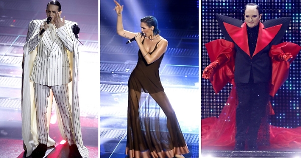 "Guardami gli occhi e non le poppe" è il nuovo "Pensati libera" di Maria Tomba. Un look senz'altro ironico che però non buca lo schermo. Voto: 4. Abbandona gli stilemi della rockstar d’annata Damiano David, super ospite della seconda serata e veste i panni del dandy raffinato. Sul palco sceglie due look custom made realizzati da Alessandro Michele per Valentino. Raffinatissimo in tuxedo con giacca in grain de poudre nero, fiocco in raso e guanti in pizzo neri, più bohemien il pantalone in grain de poudre ciliegia, camicia di seta avorio e sciarpina con frange. Voto: 7 e mezzo.