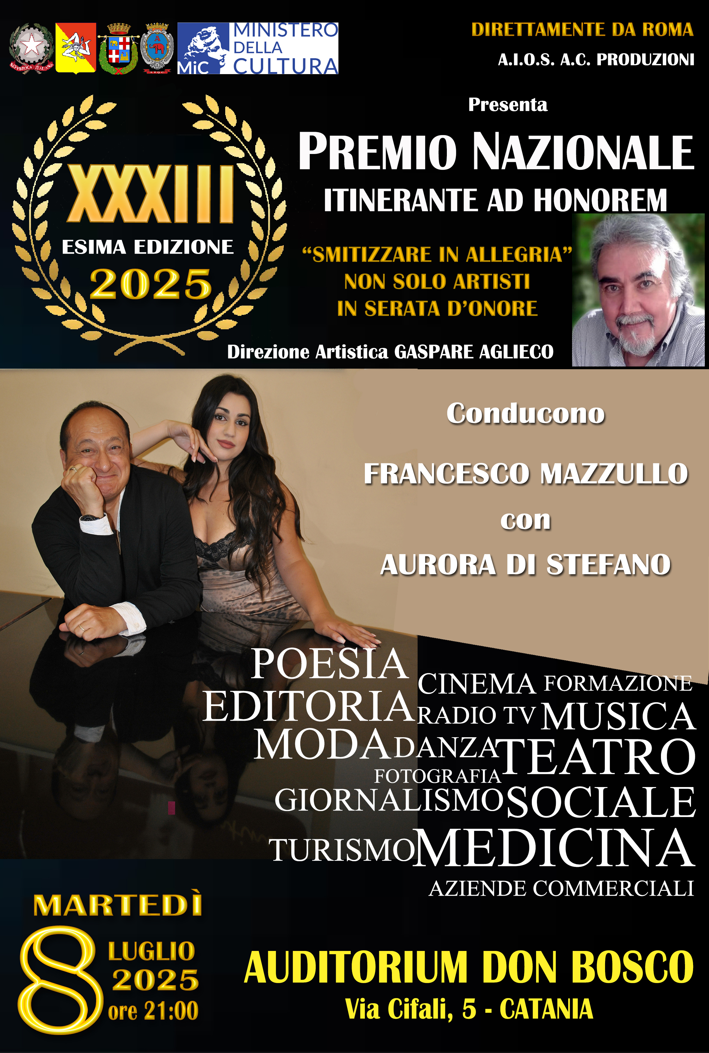 Ai nastri di partenza la XXXIII edizione del Premio nazionale itinerante ad honorem: «Smitizzare in allegria – Non solo artisti in serata d’onore» che grazie ad Aios Produzioni da Roma approda a Catania, il prossimo 8 luglio, nella splendida location dell’Auditorium Don Bosco in Via Cifali 5. Il Premio apprezzatissimo e molto atteso riconosce l’impegno sociale, il talento, la professionalità, ma soprattutto l’umanità di quanti operano con successo nei vari campi artistici, culturali, scientifici, sociali, nell’ambito medico e imprenditoriale.