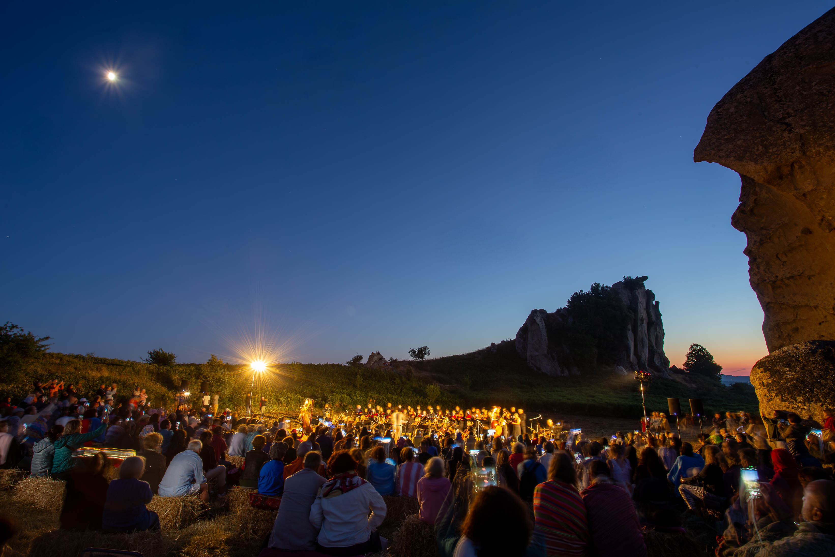 Ad accogliere il pubblico per la serata inaugurale è stato lo straordinario scenario dell’Argimusco, suggestivo altopiano nel territorio di Montalbano Elicona, conosciuto anche come lo “specchio delle stelle”.