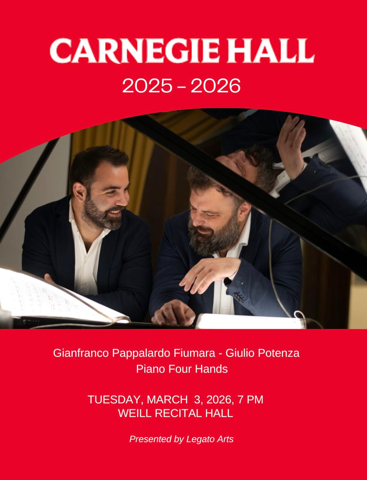 Il prossimo 3 marzo 2026, il pianista Gianfranco Pappalardo Fiumara si esibirà nuovamente alla Carnegie Hall di New York, per la sesta volta nella sua carriera. Un appuntamento di grande prestigio che quest’anno lo vedrà in duo con il pianista fuoriclasse Giulio Potenza, all’interno della stagione ufficiale della storica sala da concerto.