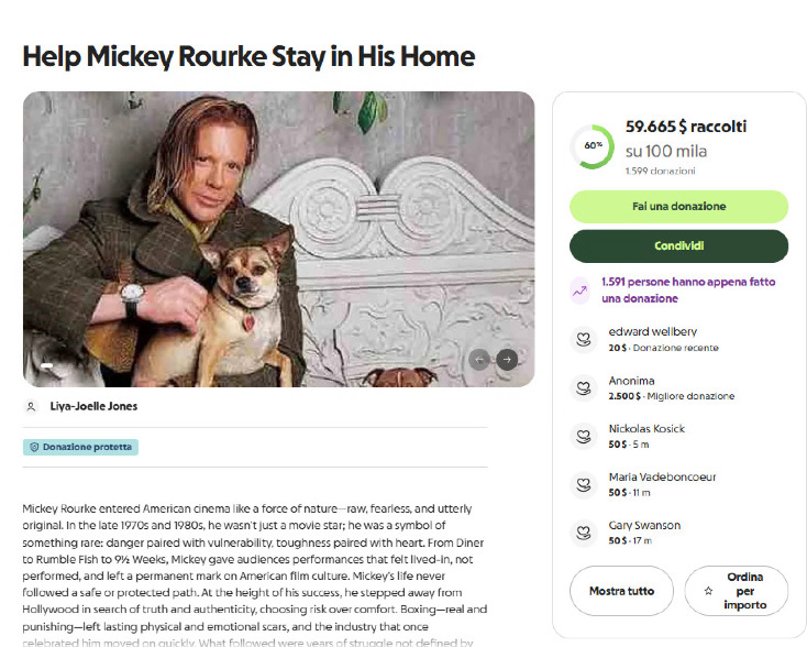 Rourke ha diffuso un video per sconfessare la raccolta fondi lanciata da Liya-Joelle Jones che, a suo nome, avrebbe creato una pagina su Go FundMe allo scopo di rastrellare decine di migliaia di dollari per pagare gli affitti arretrati che l'attore deve al padrone di casa a Los Angeles. «Sono frustrato e confuso. Io non accetto beneficienza. Preferirei spararmi», ha detto la star di The Wrestler, il film che nel 2008 fu il suo ultimo successo e lo portò a conquistare una candidatura agli Oscar.