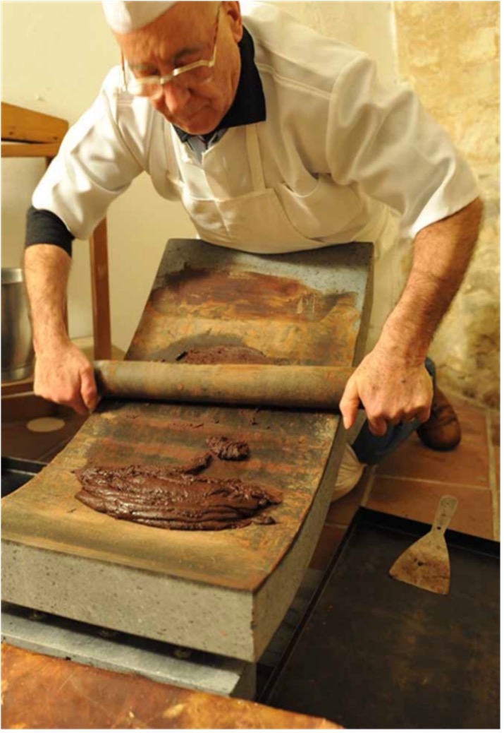 Ma c'è di più. Ed è ancora la professoressa Dormiente a metterlo in evidenza. Stavolta, l'attenzione è rivolta a uno dei grandi scrittori siciliani del Novecento. "All’indimenticato Leonardo Sciascia, precursore della tutela Igp al cioccolato di Modica - spiega - sono dedicate le Gallerie artistiche, dove figurali cioccolati e pannelli dipinti con liquido cioccolato rievocano le pietre ricamate della città. Scalpellini, giovani studenti del Liceo Artistico “T. Campailla” e artisti modicani - quali Elisa Corallo, Salvatore Cicero, Enrico Candiano, Antonio Licitra e Piero Puglisi - hanno materializzato lo spirito fondante del cioccolato come ispiratore d’arte. Il Cioccolato di Modica di inarrivabile sapore, per dirla con Leonardo Sciascia, avvolge, seduce e, rievocando storie di indimenticati lasciti, rivela un patrimonio di gesti e di saperi che si è sedimentato grazie alla genialità di maestri cioccolatieri che già nel Settecento a Modica, capitale dell’omonima e potente Contea, manipolavano il mitico “cibo degli dei”. A fecondo indicatore temporale e di costume assurge, perciò, l’esito della ricerca archivistica, che ha concorso a liberare dal polveroso oblio, non solo i nomi di cioccolatieri attivi a Modica a partire dal 1746, ma anche ingredienti, computi di peso e misura, unitamente al lessico inerente oggetti, attrezzi ed utensili, con cui il cioccolatiere, appunto, amalgamava cacao amaro, zucchero e spezie: inginocchiato ed impugnando il litico pestello, ripeteva sulla valata ra ciucculatti (pietroso spianatoio in figura di mezzaluna) la gestualità di ispanica filiazione, interiorizzata da generazioni, che al fattore tempo hanno consegnato i segreti della loro artigianalità. Si è diffuso così l’inedito capitolo sull’intrigante cioccolato modicano che prima inebriò elites locali e gerarchie ecclesiastiche e che successivamente conquistò la convivialità delle borghesie cittadine fino a campeggiare nella familiarità di consumo dell’attuale società e nell’immaginario collettivo, come mirabile ispiratore di arti, letteratura, teatro, cinema ed anche degli allettanti connubi tra cibo e cultura territoriale" (sotto Salvatore Di Lorenzo all'opera nel dammusu ro ciucculattaru - foto di Giuseppe Leone).