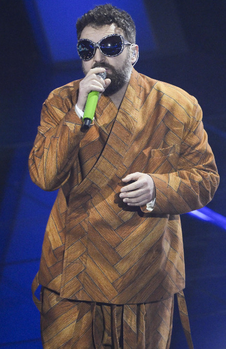 Il secondo a calcare il palco, 21:07, è stato Michele Bravi con "Prima o poi": capello lucido e un completo over firmato Antonio Marras.