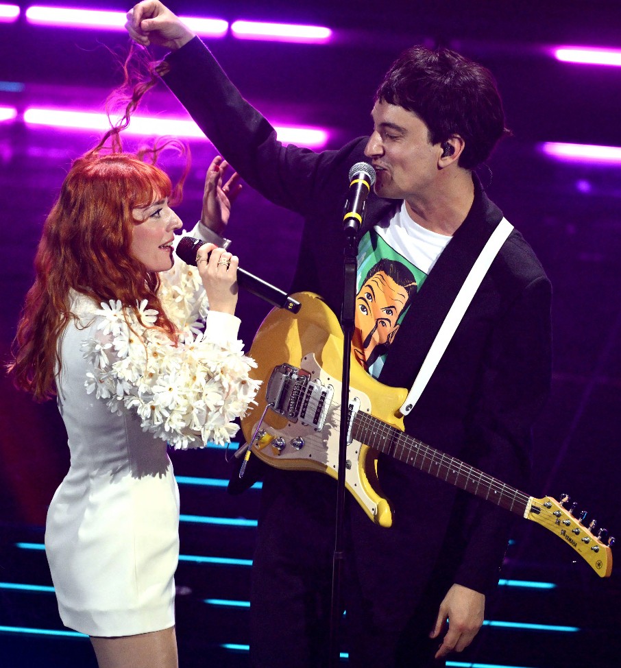 ore 01.00 Sul palcoscenico Maria Antonietta e Colombre con “La felicità e basta”. Letizia Cesarini, in arte Maria Antonietta, è tra le voci più riconoscibili e influenti dell’indie italiano. Debutta nel 2012 con un disco prodotto da Dario Brunori; sono però i successivi “Sassi” (2014) e “Deluderti” (2018), entrambi co-prodotti da Colombre, a definire compiutamente il suo profilo artistico. Il suo percorso è costellato di successi dal vivo: tournée in Italia e all’estero, partecipazione al Concerto del Primo Maggio di Roma e aperture per artisti come Calcutta, Lana Del Rey e Paolo Nutini. Artista poliedrica, è anche scrittrice, performer teatrale e giurata del Premio Strega Poesia. Il palco dell’Ariston lo ha già calcato nel 2020, ospite di Levante e Francesca Michielin. La sua pubblicazione più recente è l’album “La Tigre Assenza”. Al suo fianco, Giovanni Imparato, alias Colombre: cantautore e produttore tra i più stimati della sua generazione, esordisce nel 2017 con “Pulviscolo”, subito candidato al Premio Tenco. In qualità di producer, oltre ai lavori con Maria Antonietta, ha lasciato il segno su dischi di rilievo come “Oceano Paradiso” di Chiello, certificato Platino. Maria Antonietta ha esibito un abito che replica quello indossato da Nada nel Sanremo 1969 per cantare Ma che freddo fa. Colombre indossa invece una t shirt disegnata da Davide Toffolo che omaggia Dino Buzzati, perché il suo nome d’arte è uno dei personaggi dello scrittore.