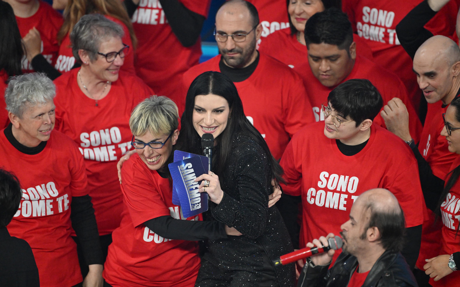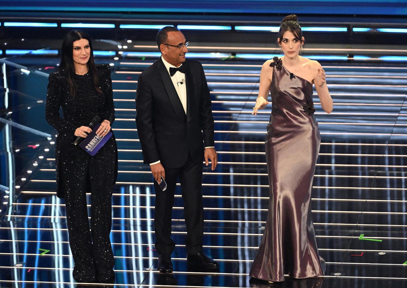 Laura Pausini apre la seconda serata del Festival di Sanremo e annuncia Carlo Conti