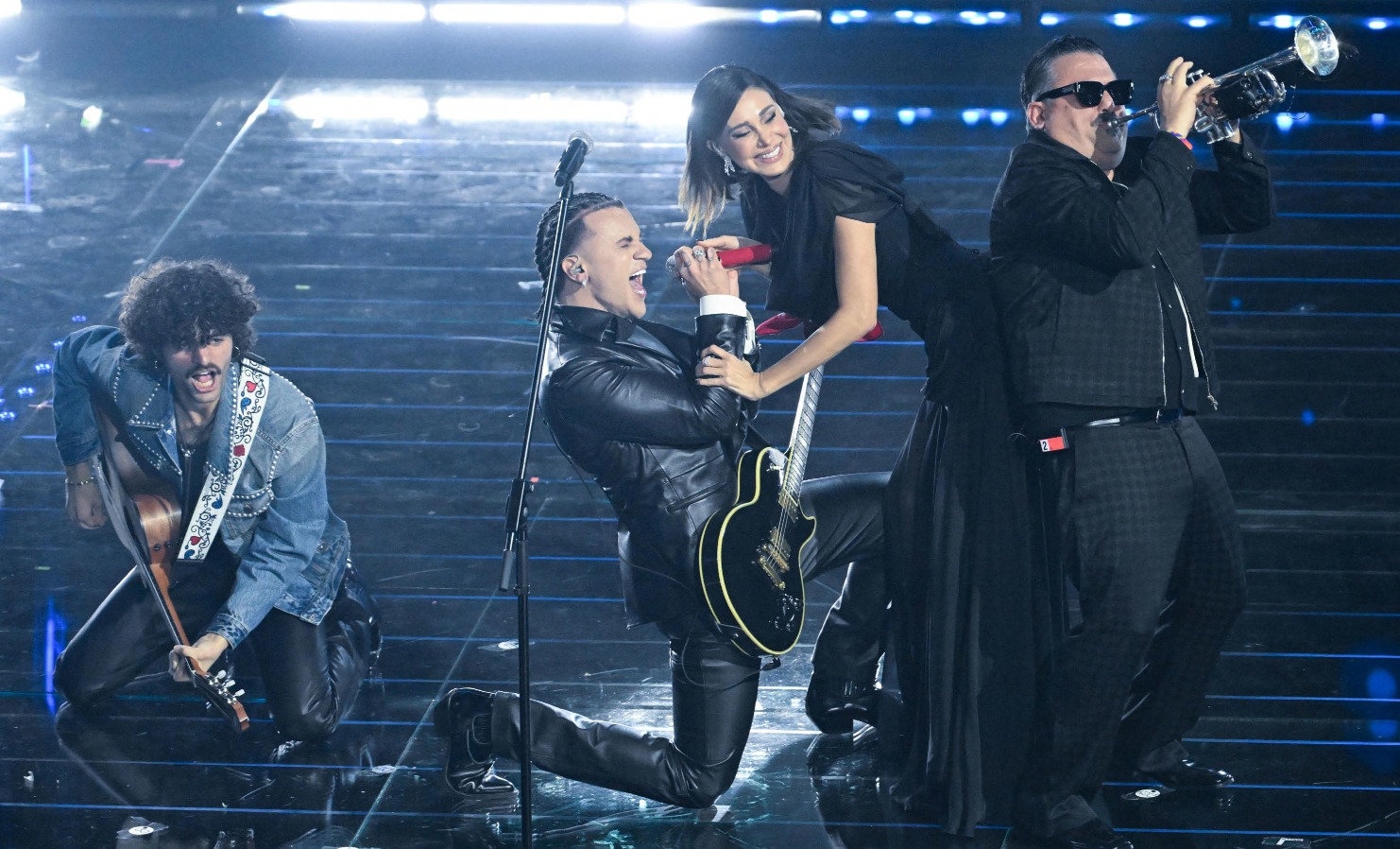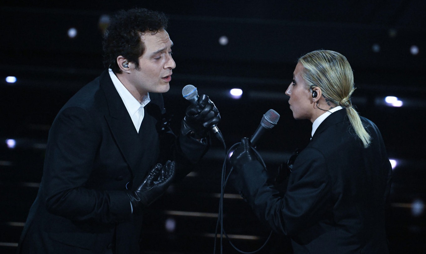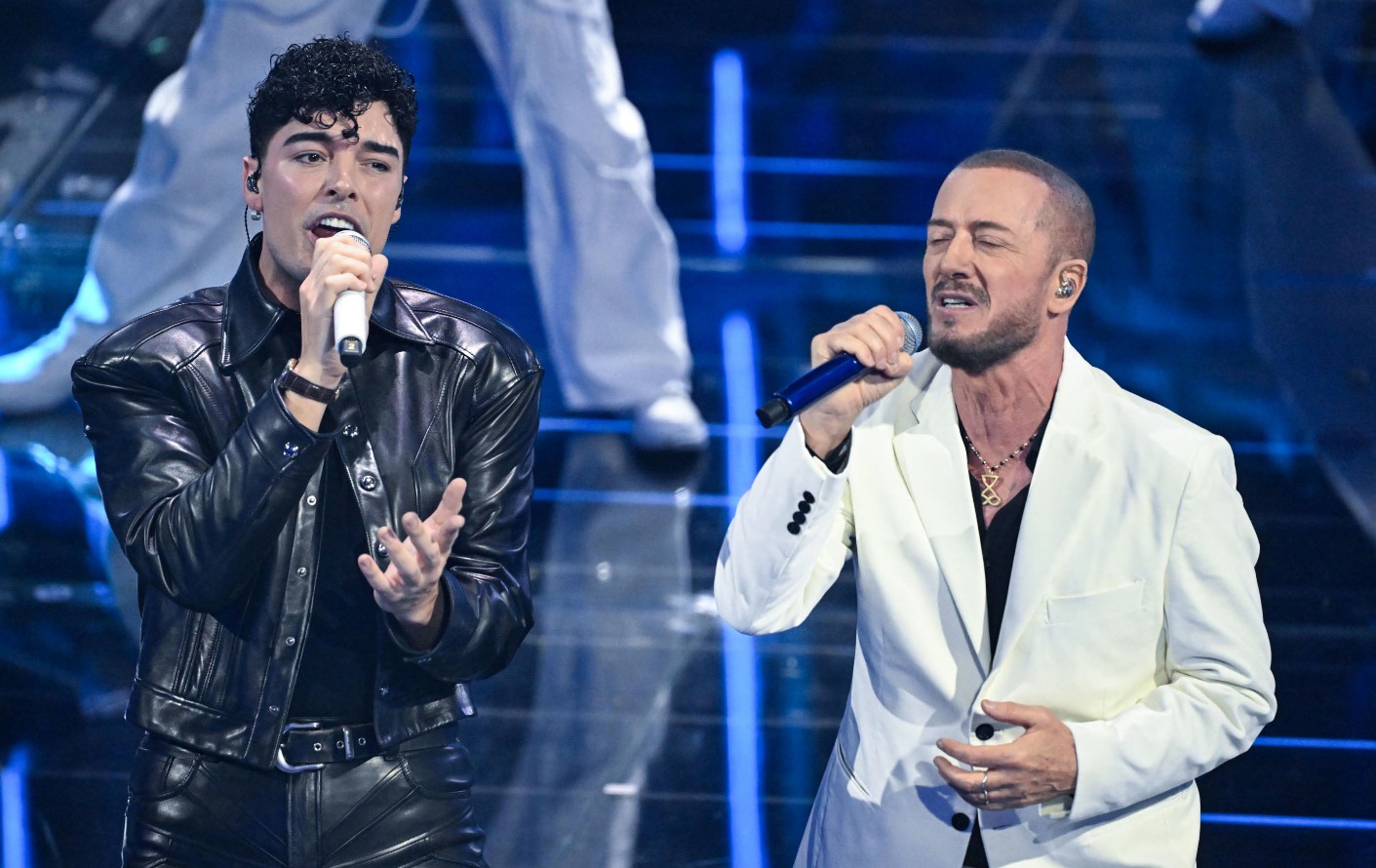 Il clima cambia bruscamente. Da colori pop e balletti travolgenti a look neri e severi, proprio come il testo del brano che cantano Eddie Brock, in una creazione Luigi Bianchi Sartoria, e Fabrizio Moro, in Corneliani.