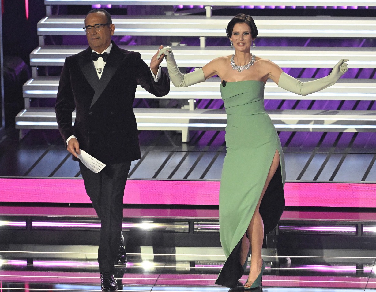 Carlo Conti finalmente in doppiopetto, si concede lo smoking in velluto di seta color melanzana, che non si dica viola, per carità, che, come dice anche nonna C**** “a teatro porta male”.