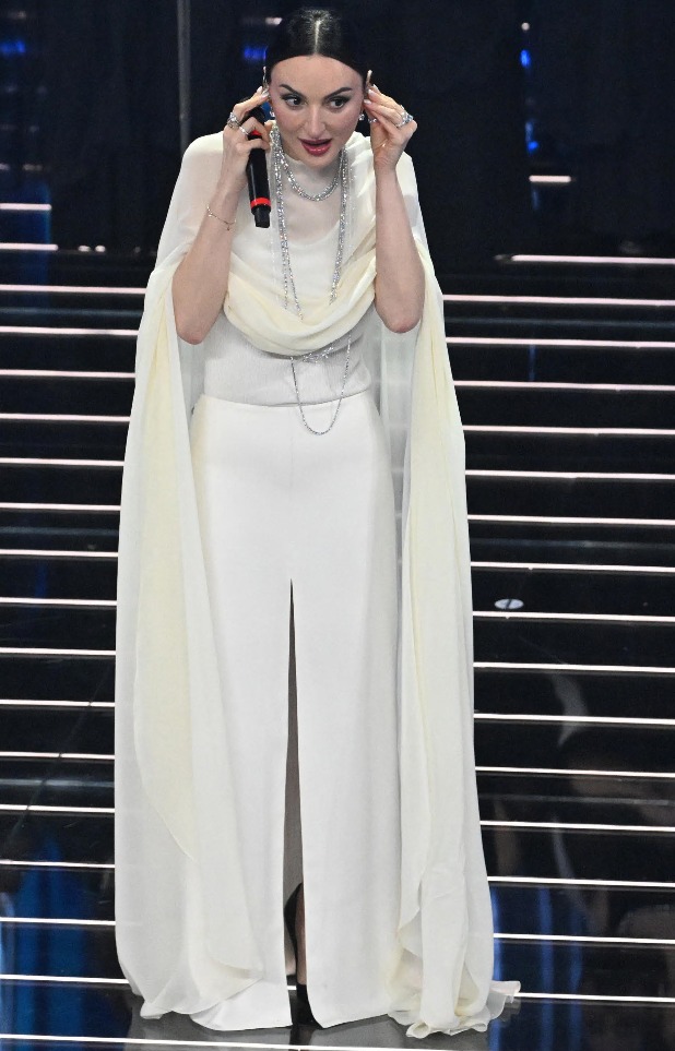 È il momento di Levante che canta “I Maschi” con Gaia. Due donne forti con due look che ne rispecchiano il carattere, in nero la prima con bustier e pantaloni ampi di Emporio Armani. In avorio la seconda con un’attitudine simile ma dalla stampa broccata d’ispirazione gitana.