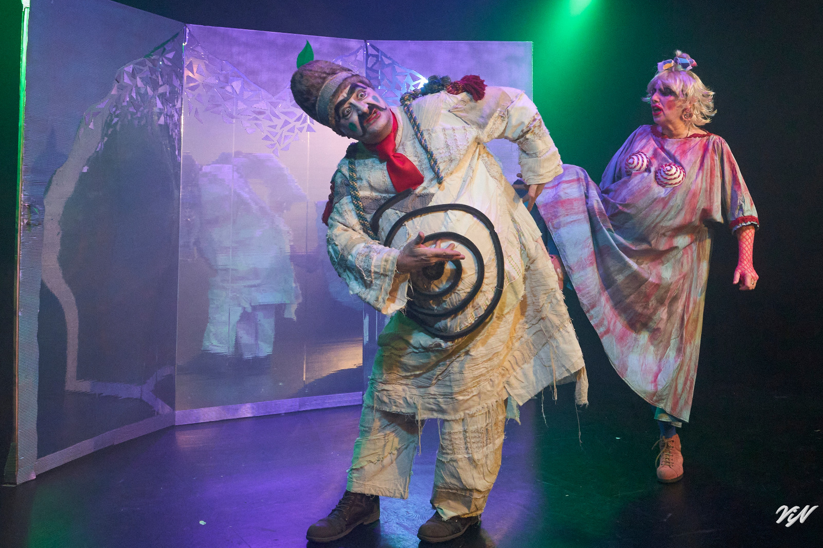 Accanto a lui, Federica Bisegna offre una Madre Ubu di grande incisività: figura manipolatrice e motore occulto dell’azione, sostiene e alimenta l’ascesa al potere del protagonista con lucidità e ferocia. Bisegna firma anche i costumi, elemento identitario dell’allestimento: non meri abiti, ma dispositivi narrativi che amplificano il grottesco, definiscono le psicologie e contribuiscono a un universo visivo deformato e potentissimo.
