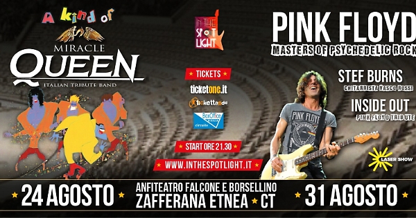 Due grandi eventi organizzati da In The Spot Light sono destinati ad accendere l’estate musicale etnea: il 24 agosto all’Anfiteatro Falcone e Borsellino di Zafferana Etnea a grande richiesta torna il “Queen tour experience” con i MIRACLE, la tribute band siciliana ai Queen che il pubblico siciliano ha già avuto modo di apprezzare in un tour invernale che ha riscosso grande successo. Attivi dal 2010 si sono imposti come uno dei migliori e più fedeli tributi alla band iconica di Freddie Mercury : la band si esibisce traendo spunto dai famosissimi live dei Queen come il “live at Wembley”, il “live at the Bowl” e il “live in Rio”, le loro esibizioni sono ben apprezzate dal mondo Quenniano soprattutto per la capacità di interpretare in maniera minuziosa e precisa le magiche atmosfere della band inglese. Per l'occasione la band sarà supportata da una band corale formata da 5 elementi e il primo violino del maestro Davide Rizzuto. Special guest della serata il Soprano Anita Venturi.