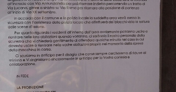 MATERA, 20 AGO - Con un avviso affisso agli ingressi di condomini e di alcune attività economiche del centro di Matera, la Lotus Production, società che cura la produzione esecutiva per l'Italia del film "Bond 25" (titolo provvisorio) sull'agente segreto 007, ha annunciato che domenica 25 agosto saranno realizzate alcune scene di inseguimento con passaggi di auto. L'attesa è ovviamente tutta - ma non solo - per la leggendaria Aston Martin, pluri-accessoriata, che ha caratterizzato gli episodi dell'agente di Sua Maestà britannica con licenza di uccidere. Le riprese sono previste tra le ore 7 e le 19 e saranno effettuate lungo l'asse via Roma-Via XX Settembre. Durante le scene - è scritto nell'avviso - alcune auto provenienti da Piazza Vittorio Veneto, la piazza principale di Matera, si dirigeranno in velocità lungo via XX Settembre. Al termine della corsa, dopo una rotatoria, le auto torneranno indietro su altre strade.
